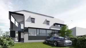 The plan is to raise the cottage to create more space underneath. Renders show a modernised, extended building in monochrome tones surrounded by lawns and gardens. Retaining the existing structure as part of the project was an easy decision for Mr Lockyer.
